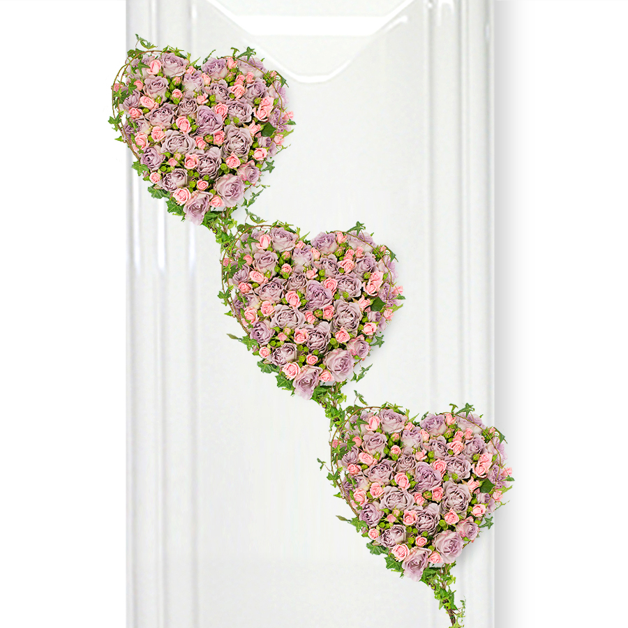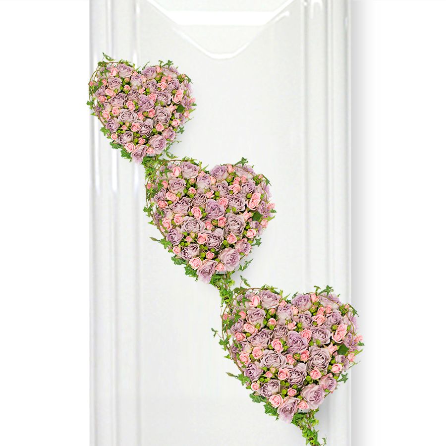 Fresh purple roses and pink spray roses are combined in a heart-shaped formation to create a thoughtful tribute which will deliver your prayers and state your true love.