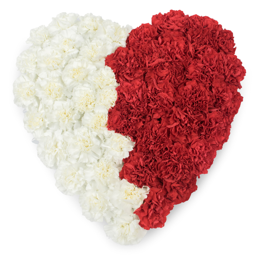 Celebrate your emotions with a sophisticated heart-shaped arrangement of hand-picked red and white carnations.